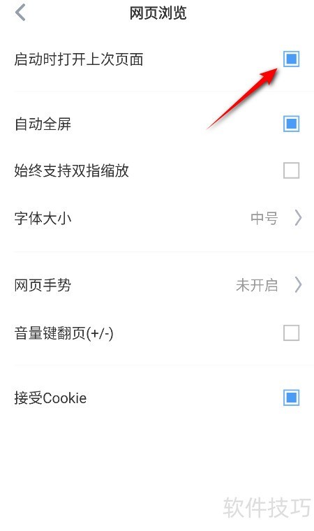 3、 取消勾选启动时打开上次页面的选项,即可关闭该功能。