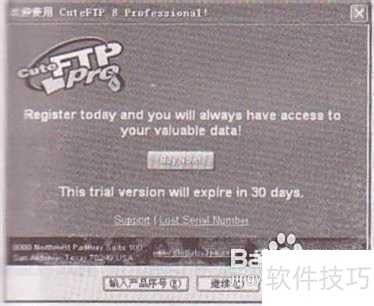 1、 打开电脑,点击菜单,依次选择→ GLOBALSCAPE → CuteFTP Professional → CuteFTP 8 Professional,即可启动软件。该程序为收费工具,需购买授权序列号方可正常使用。若未购买,可点击按钮进入试用模式,具体操作界面1所示。