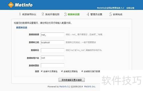 10、 若确认信息无误,请点击页面底部下一步按钮,进入数据库配置并填写管理员信息。