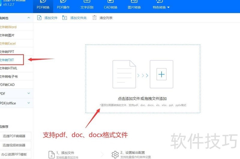 打开迅捷PDF转换器,进入PDF转换页面,选择左侧的文件转TXT功能,导入doc或docx格式的文档即可。