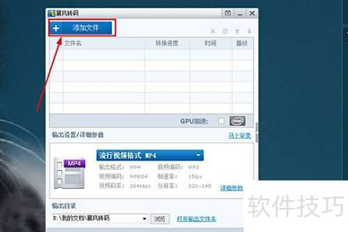 1、 进入暴风转码主界面后,若需转换音视频格式,首先应添加文件。只需点击界面上的添加文件按钮即可完成操作,具体所示。
