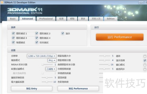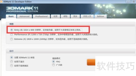 1、 启动已下载的3Dmark软件,进入主界面后,在选项中配置预设类型与运行模式,完成相关参数设置即可开始测试。