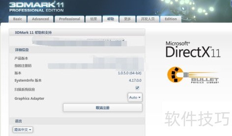 5、 在选项卡中,可查看3DMark软件的详细信息,包括产品版本、注册码及相关版本信息。
