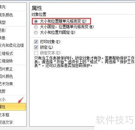 点击属性,在对象位置处选择大小和位置随单元格变化,然后点击关闭按钮。
