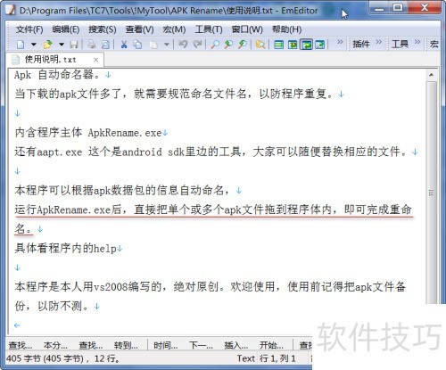 17、 通过EmEdit打开使用说明.txt,即可查看ApkRename的具体操作方法。