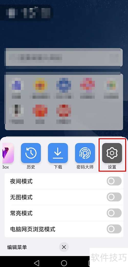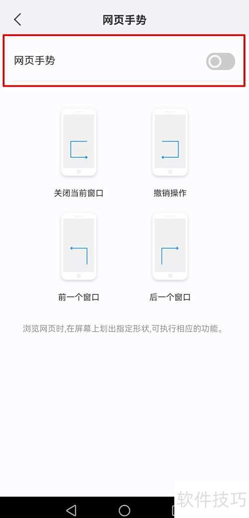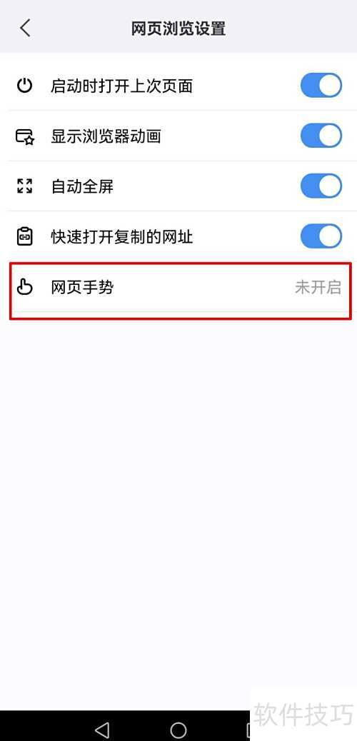 4、 进入浏览器设置,找到网页手势选项并开启该功能。