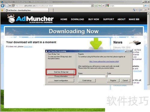 7、 打开注册界面,输入有效序列号或选择30天免费试用。