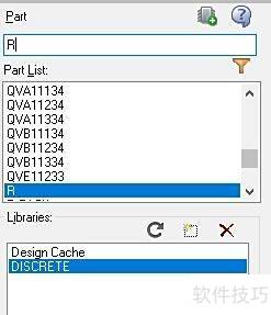 4、 在part栏输入R后选择电阻,双击将其放置到编辑页面的适当位置。