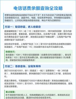 1、拨打客服热线查询这个方法最直接,也最传统,拿起你的手机,拨打10000号,这是电信的官方客服热线,接通后,根据语音提示操作,通常按某个键,就能听到余额播报了,如果不想听语音,也可以转人工服务,让客服小姐姐帮你查,不过,高峰期可能需要排队等待。
