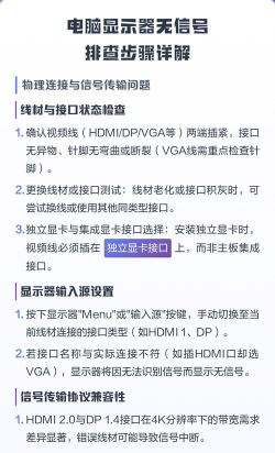 4、考虑极端情况,硬件或设置故障如果以上方法都试了,屏幕还是没信号,那么,问题可能复杂一些,比如,独立显卡坏了,可以尝试,把显示器线,接到主板的集成显卡接口上,如果这样有画面,那很可能,是独立显卡的问题,另外,主板BIOS设置,如果被错误更改,也可能导致无输出,这时,可以尝试给主板放电,恢复BIOS默认设置,当然,最坏的情况是,CPU或主板本身损坏,但这概率较低。