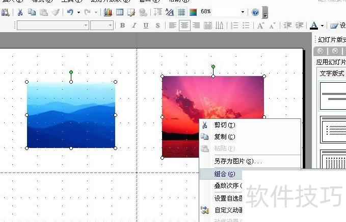 同时选中两张图片,右键选择组合功能,将两图合并为一个整体。