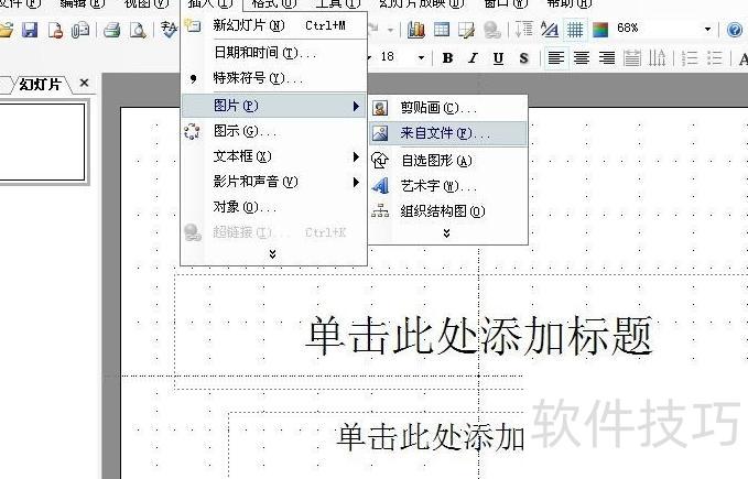创建首个PPT后,点击插入菜单,选择图片并从文件中添加。