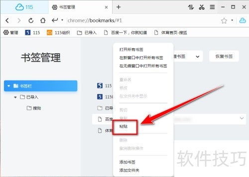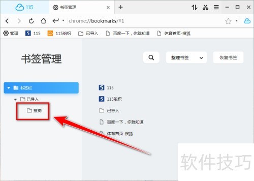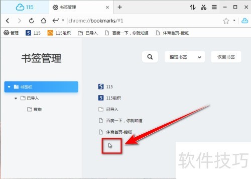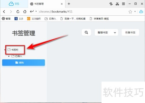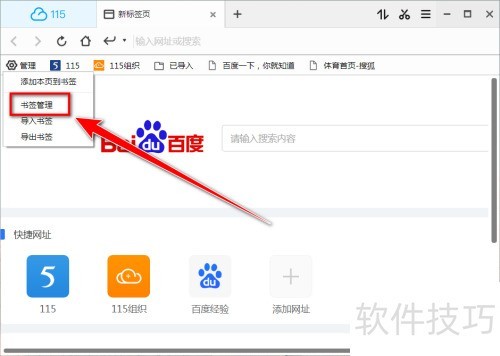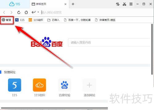 1、 启动115浏览器,点击书签栏左端管理选项。