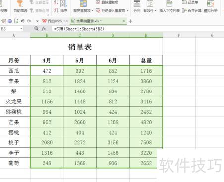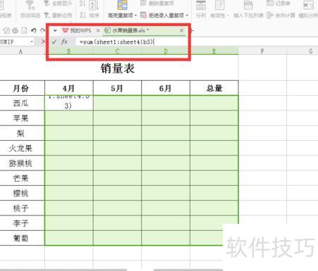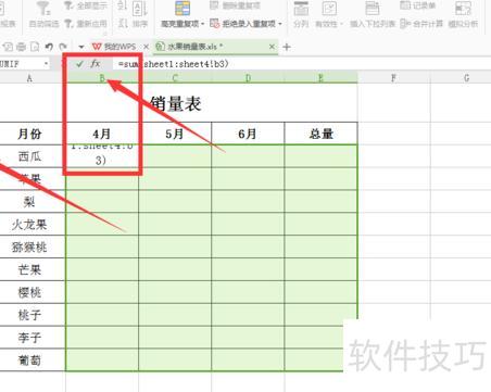 选中B3单元格,在编辑栏输入公式=sum(sheet1:sheet4!b3),按回车确认,即可得到第一个计算结果。