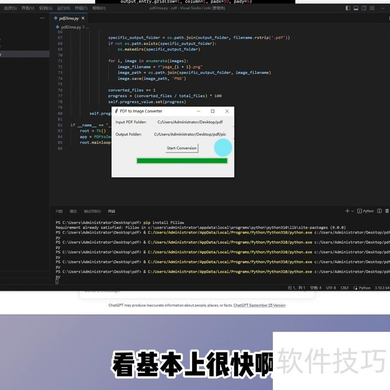 接下来需对代码进行调整,添加用户界面功能,自动生成指定名称的文件夹,用于保存转换后的图片,并提示所需引用的库。原始代码共85行,运行成功,结构简洁,便于后续扩展与操作,整体实现较为高效,具备良好的可读性与实用性。