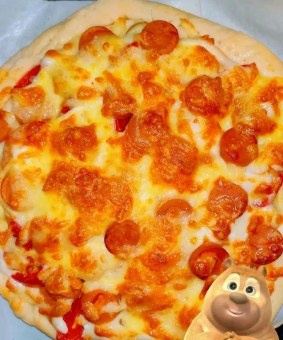 当看到,饼边金黄,奶酪融化,并且,表面有焦斑时,你的披萨,就大功告成了。