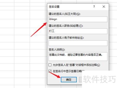 打开签名设置对话框,在相应文本框中输入建议签名人姓名、职务、电子邮箱及附加说明(可选);若不需显示签署日期,取消勾选在签名行中显示签署日期选项,确认信息无误后点击确定完成设置。