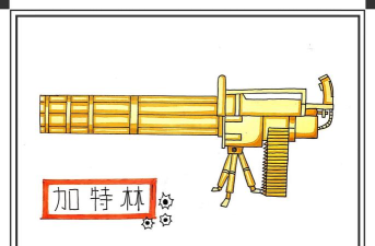 4、完善细节与添加质感让画面生动起来,刻画枪身上的铆钉、焊缝和散热片,这些细节很提神,画出清晰的扳机和握把纹理,供弹链可以简化表现,用一条折线暗示即可,关键是质感,用硬朗的线条,强调金属的厚重,用涂黑或排线,表现枪口的深洞,这样,一把加特林就跃然纸上了。