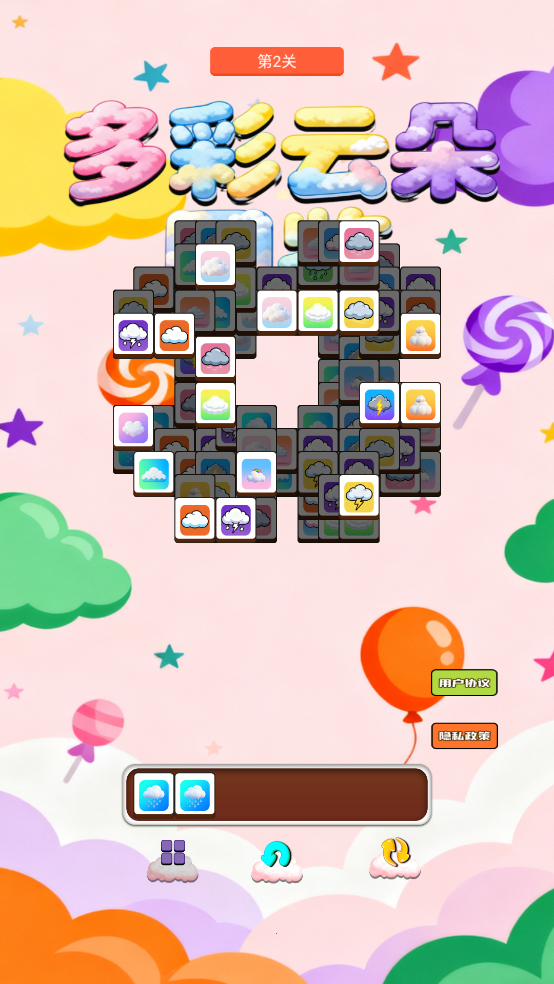 玩法还是挺简单的,就是点击三个一样的就可以消除了。画面中所有的云朵全部消除就可以过关。