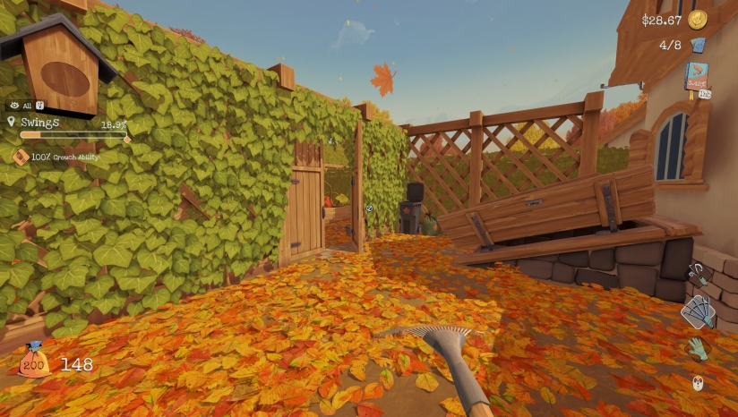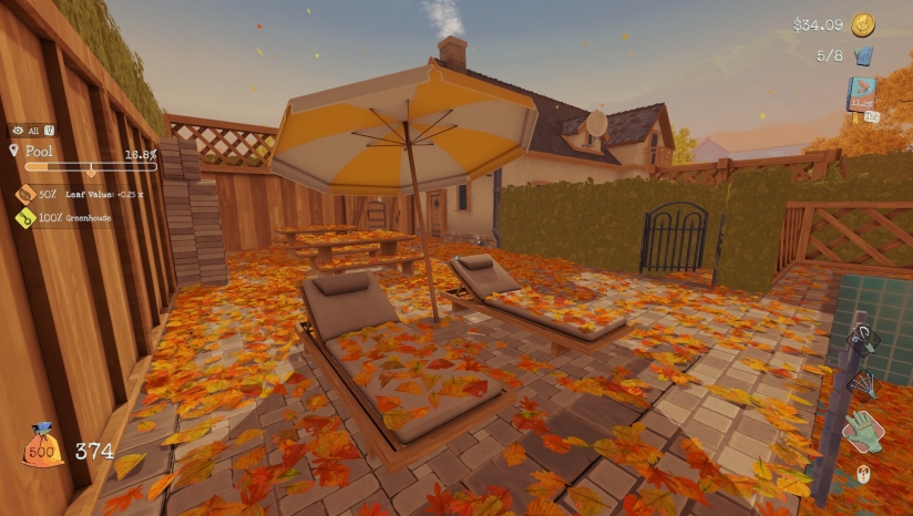 游戏初期,玩家只能徒手捡拾落叶。通过持续清理,玩家可以获得金币奖励,这些金币可用于解锁更高效的清洁工具,例如耙子、吹风机和垃圾袋。使用耙子可以将落叶集中到特定区域,吹风机能快速吹散树叶,而垃圾袋则方便一次性打包清运。玩家甚至可以尝试将落叶冲入泳池排水口,不过这可能引发堵塞问题。游戏中的房屋被划分为多个区域,每个区域设有独立的清洁进度条,玩家可以通过日志追踪任务进度。初始阶段车库处于锁定状态,玩家需要用手收集落叶积累初始资金并找到开启方法。一旦进入车库获取工具,清理效率将显着提升。游戏进程鼓励玩家通过反复游玩来提升效率,并设有基于总清洁时间的全球排行榜。