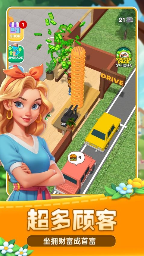 车流人流挤破店门,汉堡、寿司被一抢而空,金币蹦跶着进钱包,轻松躺成餐饮界首富~