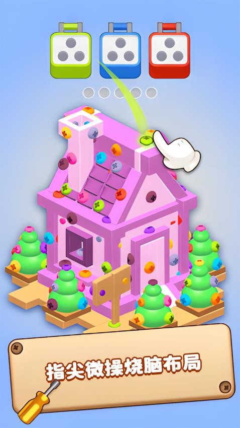 每个盒子放入三个螺丝就可以消除,从而随机刷新新的颜色盒子