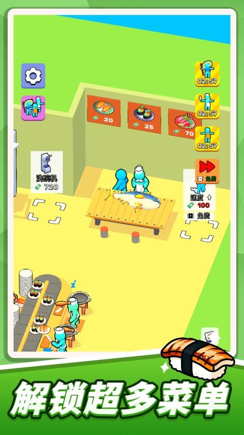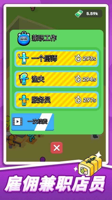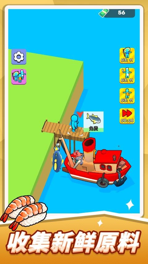 雇佣厨师、渔夫、服务员,各司其职自动干活:渔夫钓鲜鱼、厨师捏寿司、服务员送餐桌,你只需要坐等金币哗哗进账~
