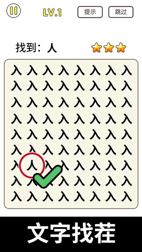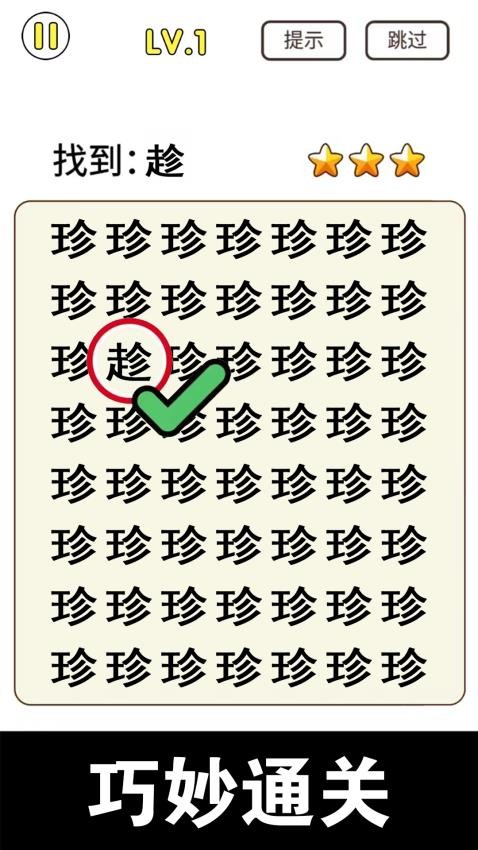 3、游戏初期,多选择简单关卡热身,熟悉不同类型差异的呈现方式,比如常见的笔画缺失、图案错位,积累经验,提高观察敏感度。