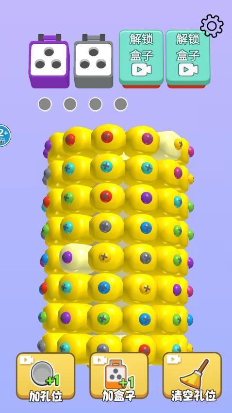 通过点击将螺丝收集到孔位中,收集的螺丝填满对应颜色的盒子时立即消除。