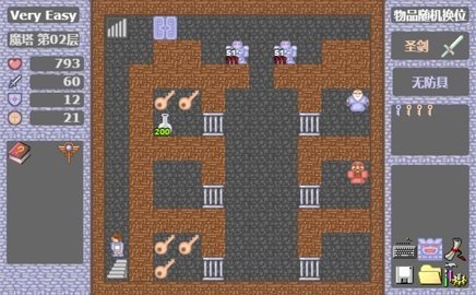 魔塔随机版是基于魔塔50层制作的随机换位版本,全塔物品随机换位,纯爽塔。玩家可以在塔内自由探索,收集武器装备和道具,随机生成的道具点位让你的游戏体验更加有趣。