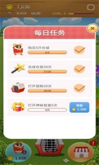 2.画面可爱:游戏设计了一系列Q版的仓鼠角色,画面风格清新可爱,无论是小仓鼠的动作表情还是游戏界面的色彩搭配,都显得十分讨喜。