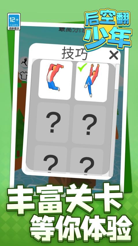 在《后空翻少年》游戏中,化身矫健的翻滚达人,在充满障碍的赛道上连续后空翻!把握完美时机,翻越障碍,在空中炫出高难度特技,以获取丰厚奖励。用奖励升级你的翻滚技巧,解锁更酷炫的动作,成为翻转腾挪的无敌少年!
