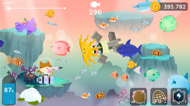 1、点击操控特殊的猫猫武器之后,可发射出子弹或是箭支,以便用来攻击鱼类。