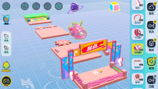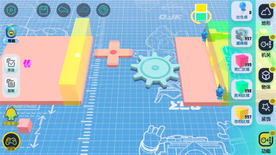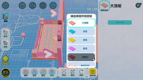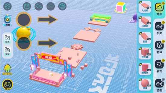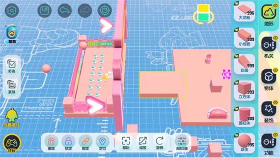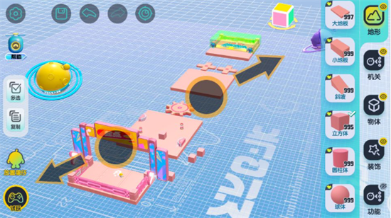 是构成关卡地图的基本组件,通过单指拖拽将地形组件放置在场景中,通过下方的操作栏,可以对选中的组件进行移动、缩放和旋转操作(默认的地形组件也同理哦),场景左边有复制按钮,以便快速复制组件。
