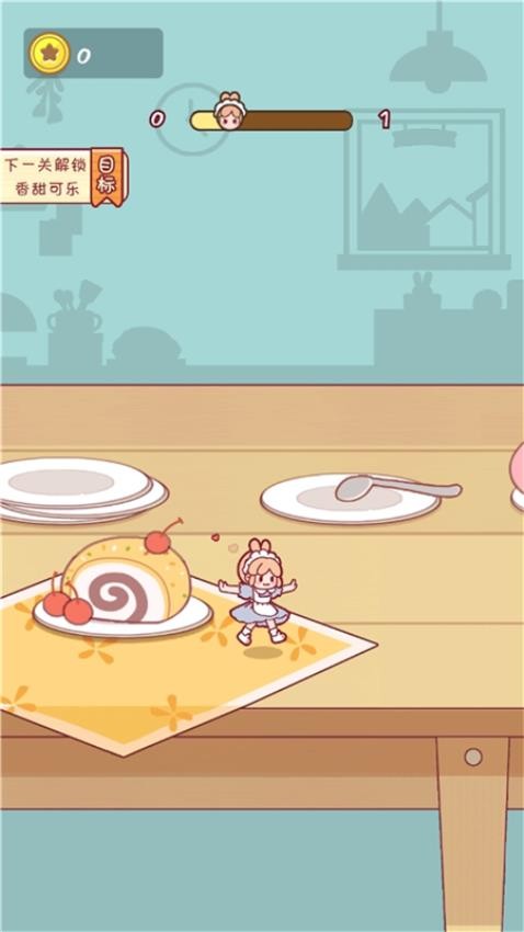 控制角色在餐桌上奔跑,需要躲避喵咪的视线,成功到达终点就胜利