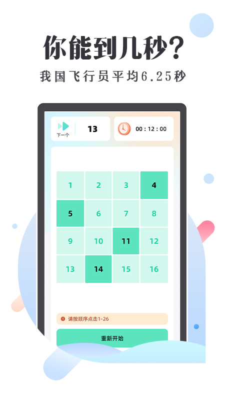 游戏的亮点在于其个性化的训练方案。它会根据玩家的游戏数据和表现,为玩家制定专属的训练计划。如果玩家在某个难度级别的表格上表现不佳,游戏会自动增加该难度级别的训练次数,帮助玩家有针对性地提高自己的能力。游戏还设有成就系统,玩家在达到一定的游戏目标后,会获得相应的成就勋章。这些成就勋章不仅是对玩家游戏成果的一种肯定,还能激励玩家继续挑战更高的目标。游戏的背景音乐和音效设计也很用心,轻松愉悦的音乐能让玩家在游戏过程中保持良好的心情,而点击数字时的音效则增加了游戏的真实感。