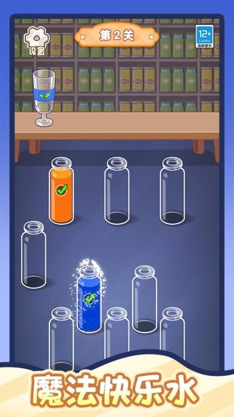 3、点击屏幕上的瓶子,将他倒入相同颜色的瓶子中即可。