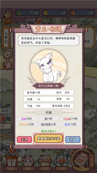 2、小狐狸有自带的属性,玩家可以重置属性以及天赋;
