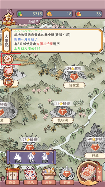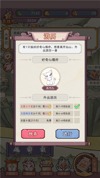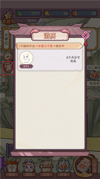 7、游历后可以点击左边图标中的选项查看游历的小狐狸,游历回来会带东西哦;