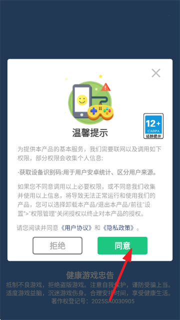 1、首先打开游戏,阅读并同意《用户协议》和《隐私政策》;