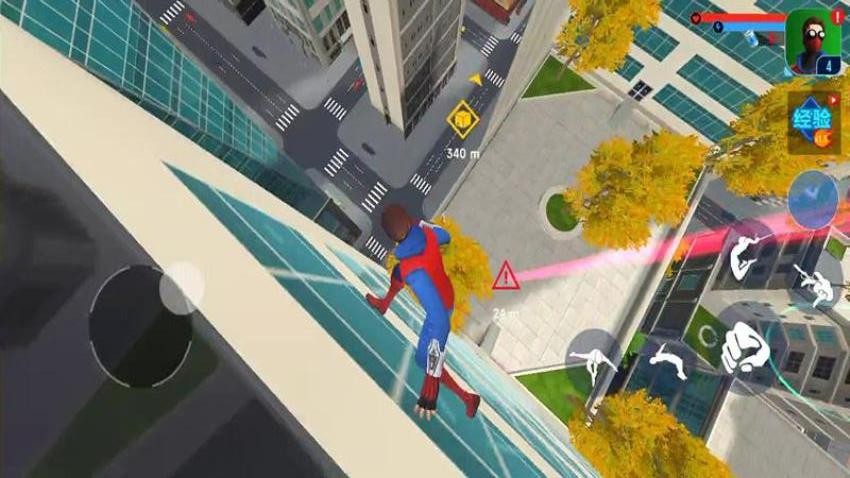 蛛丝发射飞檐走壁,穿梭于高楼大厦之间完成探索。