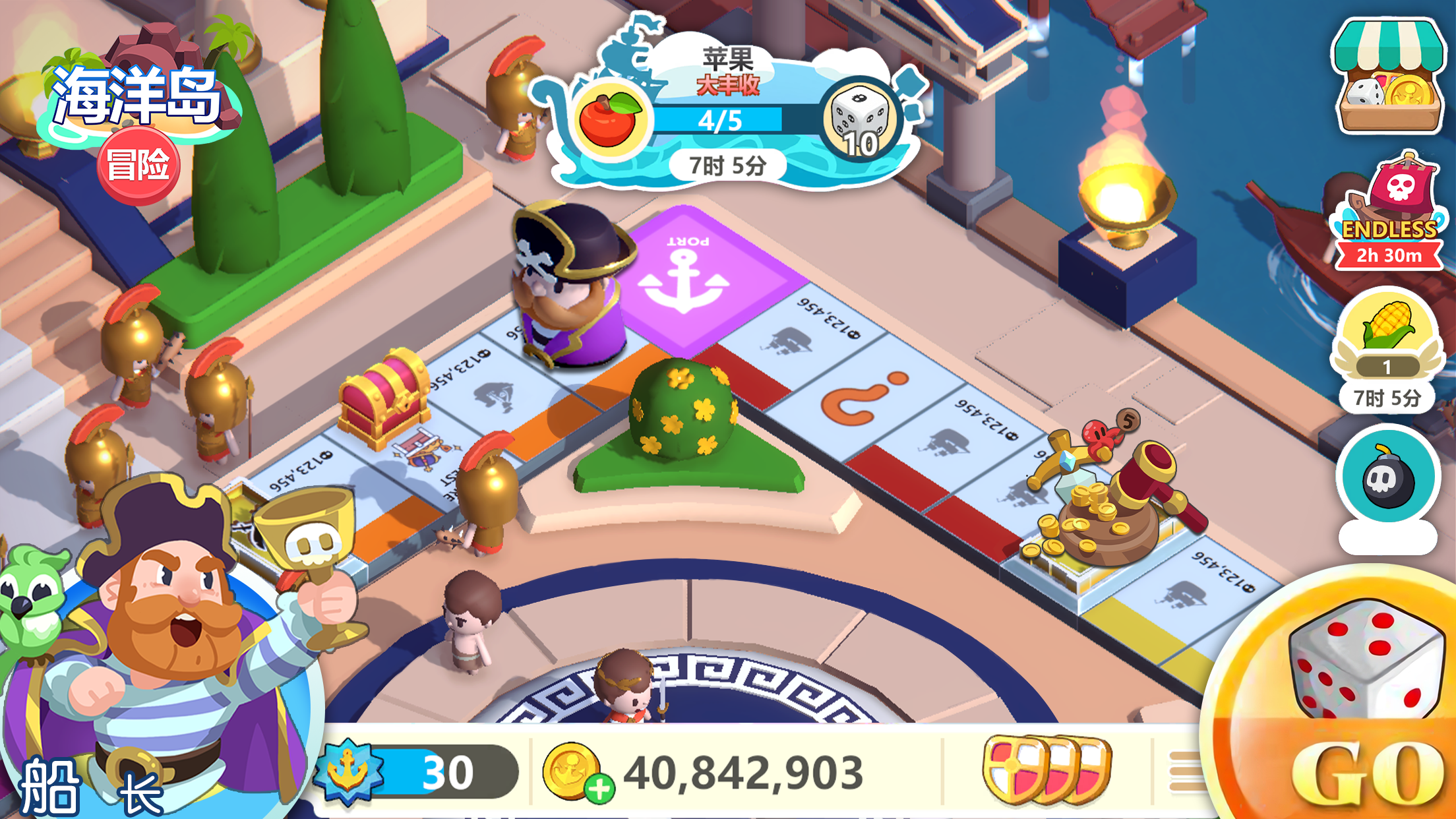 海洋岛冒险是一款融合了经典大富翁玩法与航海主题的休闲手游,将棋盘式的闯关乐趣带到了一片充满未知与宝藏的海洋世界。你可以化身为一名纵横四海的冒险家,只需轻轻按下GO按钮,掷出决定命运的骰子,就能开启一段乘风破浪的旅程。无论是探索神秘海岛、发掘远古宝藏,还是建造属于自己的领地,每一次投掷都充满了惊喜和挑战。这款作品采用Q版3D建模和清新可爱的像素卡通画风,营造出一个轻松愉快又富有策略性的冒险氛围,非常适合在碎片时间里随时随地来上一局,享受策略与运气碰撞的独特魅力。