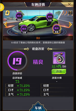 最后我又做了一个橙色座驾R8的实战对比,一辆改装4精良30级的R8可增加500万左右战力。