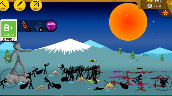 超强火柴人中通过收集资源,升级士兵和装备,提升军队战斗力;