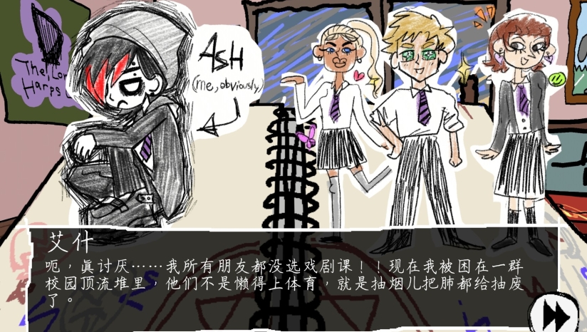 《破音青春》最突出的特色在于其真挚的情感表达和独特的音乐叙事。游戏并不试图“治愈”玩家,而是通过音乐和故事引发强烈共鸣。音乐是游戏的灵魂,融合了emo、goth和后朋克等多种风格,旋律不追求讨好耳朵,但情感密度极高,有几首歌甚至让玩家不想“打得好”,只想静静听完。游戏中的爱情线描写真实,没有“救赎型恋人”或童话结局,更多的是错位、误解和短暂的亲密,最终又各自继续沉沦,呈现出青春关系中真实而无奈的一面。游戏对“成瘾”的探讨也颇具新意,不再局限于传统意义上的酒精或药物,而是深入探讨了对情绪、标签和身份认同的依赖。