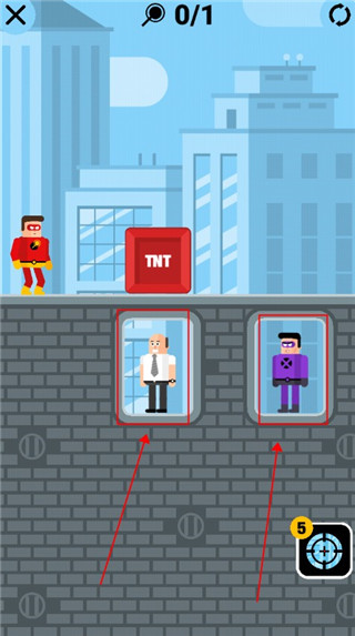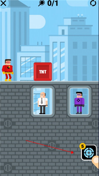 左边是人质,右边是能够隔绝你超能力的劫匪,你需要合理利用图中的物体来消灭敌人。