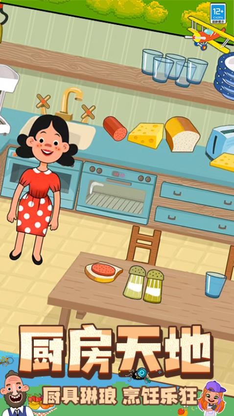 2、跟随角色进入厨房中,可以学习制作面包、三明治等等食物,还可认识各种厨具。
