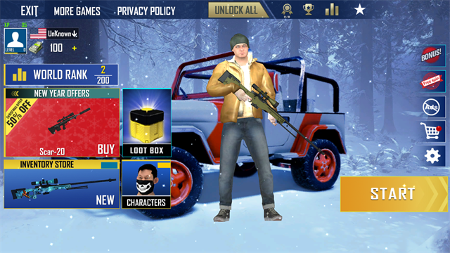《冬季生存大逃杀》是一款刺激的在线射击游戏。采用经典大逃杀玩法,场景设定在雪地山林,玩家更容易暴露,挑战性十足。你可以收集武器装备,开车搜寻敌人,正面交战或智取对手。