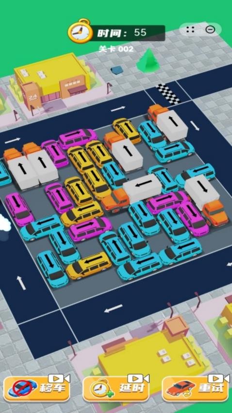 4、散发逻辑思维进行全方位的安排,尤其是细节方面要反复思考,移动全部车辆离开停车场才能过关。