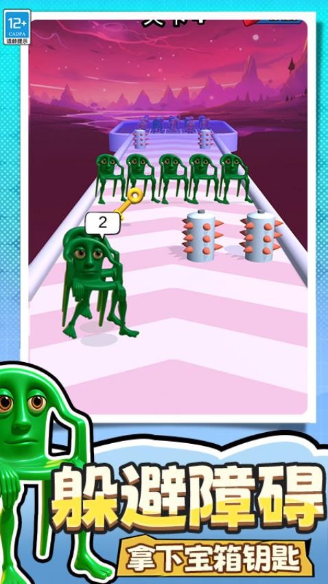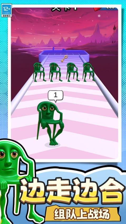 玩家需在跑酷过程中边移动边合成角色,组建队伍对抗前方阻拦的敌人。游戏融合排兵布阵的战术玩法,通过合理搭配不同能力的搞怪角色,在多人乱斗中造成暴击伤害。操作简单流畅,需灵活躲避障碍并收集道具,解锁宝箱钥匙等奖励。